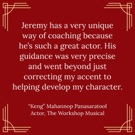 Jeremy specializes in dialect coaching and accent reduction for actors and public speakers. He draws from his years of experience as a native American English speaker growing up in Texas, working in entertainment in Los Angeles, and living abroad in Southeast Asia.
